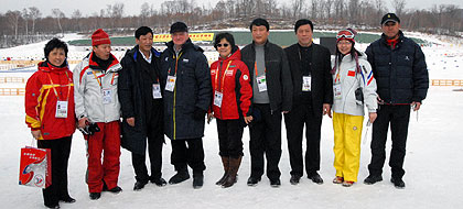 There was some excitement in the Maoershan venue for the visit of FISU President George Killian, and of his wife. Mr. Killian was hosted by the Mayor of the Village, Mr. Xu Wendong, by the Vice-Mayor and by our Vice-Chair of the Ice Hockey Technical Committee Mr. Zhiqiang, who is the coordinator of all the events that are taking place in Maoershan. Mr. Killian had the opportunity to visit the FISU Office which also hosts the CIC Committee. From there he could have a wonderful view over all the snowboard venues. Although protocol is a very serious matter, Mr. Killian took the time to see the sports venues. Just after the flower ceremony of the biathlon 10km sprint, he could meet the Technical Delegate Ubaldo Pruckner and CT Chair Andres Rybar and tell them how impressed he was by the venue and the way they had collaborated in order to build it. Just after biathlon Mr. Killian jumped into a grooming machine to climb the hill to the half pipe venue and to see the men’s qualification heats both won by a Chinese rider. He took also the time to meet the FIS Technical Delegate Mister Peter Krogoll and the CT Chair Mr Wojciech Golebiowski. After a quick ski doo trip it was time for lunch and a return to Harbin.
