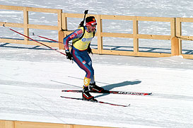 The Biathlon Pursuit event is easy to understand: you start in the same position as the one obtained after the sprint competition. This means that the winner of the 10km sprint men, the Russian Artem Gusev was the first to take the start 2 seconds before the Ukrainian Oleg Berezhnoy and 27 seconds before the Czech Jaroslav Soukup. In fact the race for the podium went only between those three biathletes. Despite 4 penalties loops, Gusev came together with Berezhnoy (1 penalty loop) for the last of 4 shootings. But the Russian missed the target four times and will never see the end winner Berezhnoy again. Gusev despite 8 missed shots was quite happy to clinch the silver medal after beating Soukup in the last sprint.