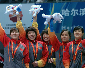 Zhou Yang and Liu Qiuhong with their teammates at the medal ceremony at the 2009 WU in Harbin