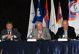 FISU President Killian atthe CTI meetingIn the afternoon the delegates inspected the Belgrade Fair where five sports will be staged, i.e. Artistic and Rhythmic Gymnastics, Judo, Taekwondo and Fencing. From there the party visited three more basketball venues: FMP Basketland, FMP Basketcity and SH FMP Zeleznik. The tour ended with a visit of the Diving competition and training venue SC Kosutnjak.