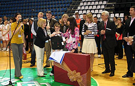 During the halves rest, after the Universiade anthem was played, Marina Djordjević was presented with gifts for winning the recent contest for the Universiade mascot’s name. According to custom in Smederevo, where Marina lives, the godmother presented her “godchild” with flat bread and a basket of apples. She also recited a poem she wrote for Srba.