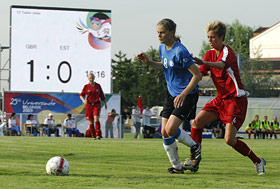 Great Britain vs. Estonia (10-0)Although it is a bit strange for the athletes to begin competition before the opening ceremony takes place, the involvement of the players was complete beginning with the kick-off of the different matches. Without any second thoughts, the objective truly was to enter the competition and come away with a victory. Under changing skies, with sunshine occasionally making its way through continual showers, the matches took place without mishap, with an average temperature of 28°C.