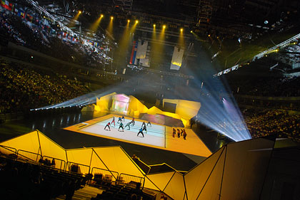 Little Ana The participants witnessed a high-tech performance of cybernetic works created out of computer-electronic, organic and time and space systems, transformed into a dance performance. A beam of light coming out of the projector animated the stage, portals and the 700 m²-Arena floor and created illusion of movement. The audience witnessed the floor change from swimming pool to basketball court to football pitch to finally turn into a dance stage where the Universiade participants saw a choreography performed by some thirty local students blended with the fusion of traditional sound, ethno-musical motives and modern vibrations while a stream of consciousness of thoughts lead the spectators through the spectacle of light, dance and computer art.