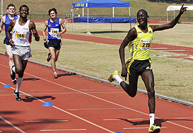 Duar Yoa of the University of Ballarat taking gold in the men’s 5,000 metre final. Hintsa Mebrahtu of Griffith University finished second (photo: Greg Young)