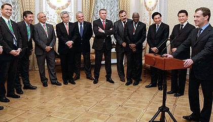 Russian President Medvedev talks to the ISF Presidents (left FISU Vice-President Bergh)
