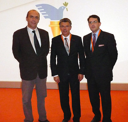 Marc Vandenplas (l) and Kolë Gjeloshaj (r) flank Peace & Sport President Joël Bouzou
