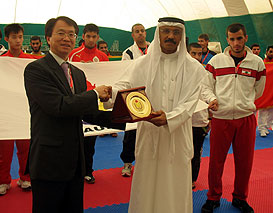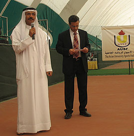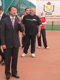 Dr. Omar Al HaiOC President and FISU Assessor Dr. Omar A. Al-Hai, delivered a welcome speech and wished all the officials and students an enjoyable stay. Mr. Kenny CHOW, AUSF Secretary-General, was invited to deliver a speech on behalf of AUSF. He expressed his sincere gratitude to the OC, under the leadership of Dr. Omar A. Al-Hai for its wonderful job and also to the participants for their strong interest in AUSF activities. After his speech, Mr. Kenny CHOW also declared the opening of this championship and presented Dr. Omar a Gold AUSF Plate. Finally, students from Egypt played a demonstration match of speed ball, in the hope to promote the development of this sport event in Asia.
