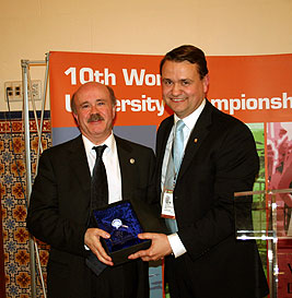 FISU Vice-President Stefan Bergh presents a FISU plate to the Vice-Chancellor Josep Lluís Sirera