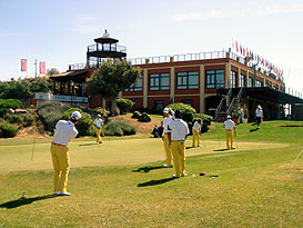 The Korean Team practising in the putting area in front of the driving range and club house