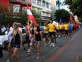 The Marching Parade of the DelegationsIn the evening, in the center of Alanya, the Opening Ceremony was staged in an excellent atmosphere in front of a mixed domestic and international audience, who are spending their vacation in this beautiful summer holiday city. After the welcome speeches of Mr. Kemal Tamer and Mr. Ralethe Malumbete, the Governor of Alanya, Mr. Hulusi DOGAN declared the 5th WUC Beach Volleyball open. For a young TUSF which has been founded in 1996, this WUC will bring again to young student-athletes a great sport atmosphere to enjoy not only the competition but also a terrific hosting of Alanya city, a genuine tourist destination. The Cultural program was chosen carefully involving student dancing groups to show their performance in Latin dance and traditional folklore. The participants really enjoyed this program and some of them even started dancing as well.