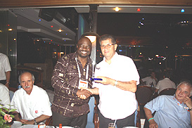 CISCA Chair Ralethe presents the Governor with a FISU souvenirAfter the Ceremony, the Heads of Delegation and FISU representatives were invited to the official welcome dinner hosted by the Mayor of Alanya Mr. Hasan SIPAHIOGLU, who unfortunately was excused at the last moment and was represented by the Sport Director of Alanya Mr. Saim KANLI. During the dinner CISCA Chair Ralethe Malumbete on behalf of FISU President George KILLIAN presented the Governor of Alanya, the OC President and the Mayor of Alanya (represented by his Sport Director) with a small appreciation from FISU as a souvenir for this WUC.