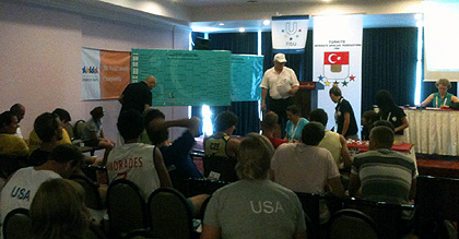 During lunch time the General Meeting for Women (12:30) and for Men (15:00) was held. During this meeting the seeding for the PLAY OFF pools was drawn.The results can be found on the website of the OC for double elimination of Men at http://www.wubc2010.org/results/men_double_elimination_17_06.pdf