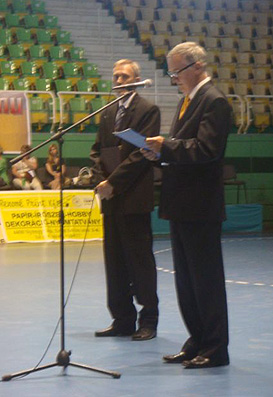After the awarding ceremonies, the Closing Ceremony took place at the Nyiregihaza Sports Hall. The Closing Ceremony started with the Hungarian national anthem. After the anthem representative of the Organizing committee Andor Tompa and representative of the FISU Executive Committee Mr. Marian Dymalski said the closing speeches. Mr. Dymalski thanked the organizers for their effort for the organization of the 20th World University Handball Championship. This memorable moment was according and following the FISU protocol. FISU anthem was played; flags went from the hand of the Organizing Committee through the FISU representative to the hand of representatives of the Blumenau Organizing Committee of the 21st World University Handball Championship.
