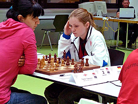 Meanwhile the women’s tournament saw a major upset. On board one Germany’s Sarah Hoolt was not impressed at all by her opponent’s higher rating. Soon after the opening she played a beautiful positional exchanged sacrifice, followed by a further pawn sacrifice. Masterfully she built up her attack afterwards and when a White pawn had reached the seventh rank it became obvious that Black was in deadly danger. Seven moves later a pretty bishop sacrifice sealed the fate of the game.