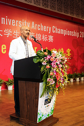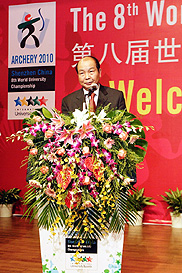 A welcome speech was delivered by the Vice-President of the Organizing Committee of the 8th World University Archery Championship, Mr. Liang Daoxing, who is also the Vice-President of the Executive Board of the 26th Summer Universiade. As the CISCA Chair of this event, FISU Assessor Omar Al-Hai thanked the local people for their wonderful job and invited the FISU President George E. Killian to express his gratitude. Vice-Mayor of Shenzhen City/President of the Organizing Committee of the Championship, Ms. Wu Yihuan declared the official opening of the event.