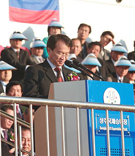Mr. ChowHe then gave the floor to Mr. Kenny Chow, FISU EC member, who thanked the governor and the minister of sports and Mr. You, KUSB President because of the importance they attach to the development of university sport. He also thanked the volunteers and the delegations on behalf of FISU President Killian. He stressed the fact that this championship is the last in a year dedicated the FISU World University Championships. A year full of positive experiences that no doubt will leave an unforgettable memory to many of our student-athletes. He then formally invited the Minister for Culture Sport and Tourism, Mr. Yu In-Chon, to open the Championship. A thunderous applause followed and then the FISU flag was hoisted.
