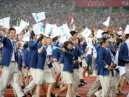 North & South Korea march in together at the Opening Ceremony of the 2003 Summer Universiade in Daegu, Korea
