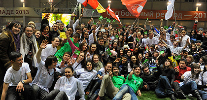 Over 1,200 participants got involved in the East vs. West clash to support Russia’s bid for the 2018 FIFA World Cup. The unique match featured 41 sets of teams. The non-stop match that took place in the football and athletics arena of Kazan’s Central Stadium brought together officials of Tatarstan’s Government and the Kazan Mayor’s Office, veterans of sports, children of sports schools, students of Kazan’s universities and institutes, media representatives, Kazan 2013 volunteers, residents of the Universiade Village, organizers and partners of the 2013 Universiade as well as members of Tatarstan’s Amateur Football League.