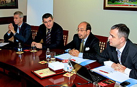During their stay in Novi Sad, the EUSA representatives led by the President Mr. Alberto Gualtieri also met with the representative of the Sports Academy Belgrade to discuss the future mutual collaboration on the field of the university sport. After that a reception was held for the EUSA Executive Committee in the City Hall. The City Councilor for Sport and Youth Mr. Aleksandar Kravić welcomed the guests. In his speech Mr. Gualtieri thanked the host for the welcome and presented him the EUSA Plaquette. ‘Novi Sad organized three European and two World University Championships in the last ten years and we are grateful for the affection to the university sports the City shows’, he added.