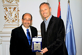EUSA SG Pecovnik receives the award from Mr. MatytsinIn the last part of the meeting the discussion on the cooperation with EUSA members, FISU, continental federations and other organizations was held. At the end of the meeting a special recognition was given to Mr. Matjaz Pecovnik, EUSA Secretary General. On behalf of Mr. Dmitry Medvedev, the President of the Russian Federation, a medal and diploma were presented by Mr. Oleg Matytsin, the President of the Russian Students Sport Union to Mr. Pecovnik for his contribution to the development of the International Sport.