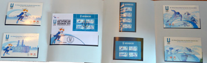 A nice eight-page leaflet has been published containing a real treat for the avid University Sport stamp collector, i.e. four prepaid postcards (2 x 90 kurus and 2 x1.30 TL) of which two depict the Games Mascot, Snowy the double headed eagle, one depicting the ice sports and another the snow sports. Included in the leaflet is a first day sheet envelop with a set of four stamps and the first day cancellation. Besides these treats there are two sheets of stamps ( a set of 4 and one of 5) of different values (90 kurus & 1.30 TL) with both the FISU logo and the Universiade logo together with different items such as the mascot, the ski jumping towers, an ice hockey player and other historical landmarks like the double minaret madrasha.