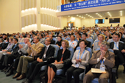 After the official opening of the conference, Alison Odell, CESU vice-chair and new elected 1st FISU assessor has presented the 1st key-note speech “London 2012: Shaping legacy”. Sustainability, partnership, cohesion, inclusivity have appeared as key elements while preparing strategy for the organisation of the 2012 Olympics and Paralympics Games in London. Next speaker, Xiaopei Yan, deputy director of Shenzen Municipal People’s Congress, demonstrated on example of the Shenzen Universiade in which way a major sporting event is the catalyst for driving improvement in social and economic aspects of a city and its region. Indeed, hosting sports events has become one of the major development strategies of the city of Shenzen and proved to increase the competitiveness of the city. Numbers of areas have been improved including infrastructure and transportation. The Shenzen Bay Sports Center “Cocoon” which hosted the opening ceremony is one of the 69 newly-built or renovated venues on the occasion of the Universiade. Universiade contributes also to civil spirit building with more than 1,2 million of volunteers that have been prepared and trained by local leaders in order to support the Universiade organisation.