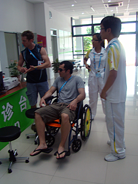 Adrían Ferreira (wheel chair) and Ernesto Stanley arriving at the Universiade Village Polyclinic