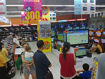 On August 18th, during the Female Football match betweenChina andBrazil a bunch of local people interrupted their shopping in the supermarket and started watching the game. Suddenly, the electronics department of the supermarket was full of “aaahhhs”,“ooohhhs”, “jia yous” and “ahh yaas” .