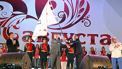Meanwhile, the Flag’s present keepers, representatives of Sberbank of Russia, passed the Flag to 2013 Ambassador Andrey Demanov, who further handed the Flag over to Tatarstan’s Minister of Youth, Sports and Tourism Rafis Burganov and Kazan Mayor Ilsur Metshin. As a representative of Tatarstan students, Timur Suleimanov, President of the Tatarstan Student League, received the Flag from the hands of the officials. Escorted by activists of the Tatarstan Student League and Kazan 2013 volunteers, the FISU Flag started its long trip to the cities of the Volga Federal District.