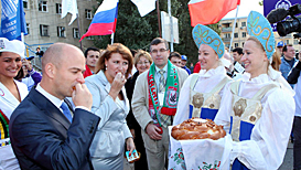 A warm welcome spiced with attributes of traditional Russian hospitality as a round loaf, a round dance and Russian folk songs, awaited the Kazan 2013 delegates at the railway station ofSaratov. «We brought a sunny weather with us! It’s a sure sign of your amiable intentions and open-heartedness of all who are engaged in the preparations for the Universiade. We are pleased that today we will become part of your united family!», Pro-Rector of Studies and Educational Work of Saratov State University Igor Malinsky said.