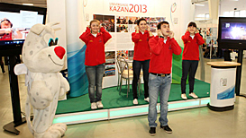 A warm welcome was extended to the special guest at the display stand of the 2013 Summer Universiade by Kazan 2013 volunteers and the Kazan 2013 escort team, the winners of the Faces of the Universiade project.