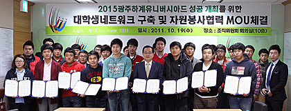 On October 19th, the 2015 Gwangju Universiade Organizing Committee (GUOC) signed a memorandum of understanding with college student representatives to build a college student network and start volunteer work, being promised an active role in the preparation of the 2015 Gwangju Summer Universiade.