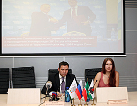 Another question the media representatives were especially interested in was the budget of the 2013 Kazan University Games. Vladimir Leonov answered that the Universiade budget was made up of subsidies from federal, regional, municipal accounts, as well as from extra-budgetary resources, such as sponsors and partners. «Nearly 40% of the entire Universiade budget comes from extra-budgetary investments. Most venues erected on the threshold of the Games, among them the international airport, Ak Bars Wrestling Palace, etc, vividly demonstrate the efficiency of the public-private partnership. We are totally grateful to the general partners of our project – MegaFon and Ak Bars Bank that not simply invest their money in the preparations and staging of the Universiade, but also develop telecommunication and banking infrastructures in Tatarstan», Vladimir Leonov stated.