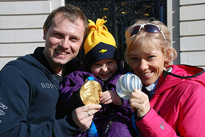 Olga proudly shows her medals together with husband Milan and son Alexander