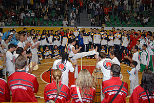 Typical Brazilian capoeiraLots of people were present in the gym honoring the athletes from 12 delegations, the pivot of the Brazilian team, Carolina Fajardo, born in Blumenau, took the Athlete’s Oath. During the cultural part of the Opening Ceremony, the delegations witnessed performances of capoeira, and typical Brazilian and German dance performances.