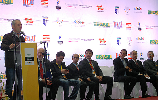 BLUMENAU – The opening ceremony of the 2012 WUC Handball took place at the SESI Sport Complex in Blumenau, Brazil. The event was attended by several authorities: Joao Paulo Kleinubing, Mayor of Blumenau; Luciano Cabral, FISU Vice-President and CBDU President; Zhang Xinsheng, FISU Vice-President; David Cabello, CISCA Chair and FISU Assessor; Franditseky Taborsky, FISU Technical Chair for Handball; Jeol Fernando Benin, representative of the Ministry of Sport of Brazil and Joao Batista, representative of the Santa Catarina State.