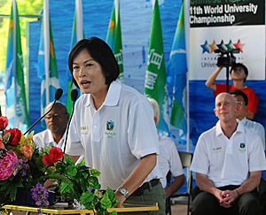 Minister Taig-Shan River. The Magistrate of Yilan County, Mr. Lin Tsung-Hsien; the member of the FISU Executive Committee, Mr. Martin Doulton; Vice-President of CTUSF, Mr. Jeng Fang-Fann and Minister of Sports Affairs Council, Dr. Tai Hsia-Ling attended the ceremony.