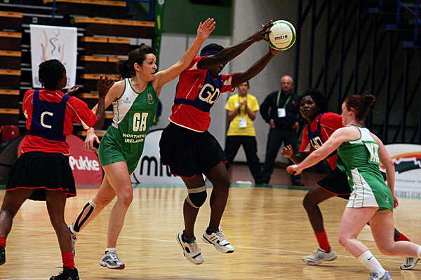Captain and Vice-Captain battle it out as Uganda’s Goal Defence Irene Mirembe snatches the ball from Ireland’s Goal Attack Caroline O’Hanlon in their quarterfinal match on Thursday 5 July 2012