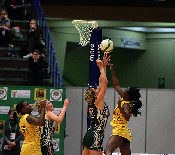 Jamaica’s Goal Shooter Vanessa Walker and Goal Attack Naudia Brown in action against South Africa’s Goal Defence Karla Mostert and Goal Keeper Vanes-Mari du Toit in the first match of the day of the WUNC on Friday