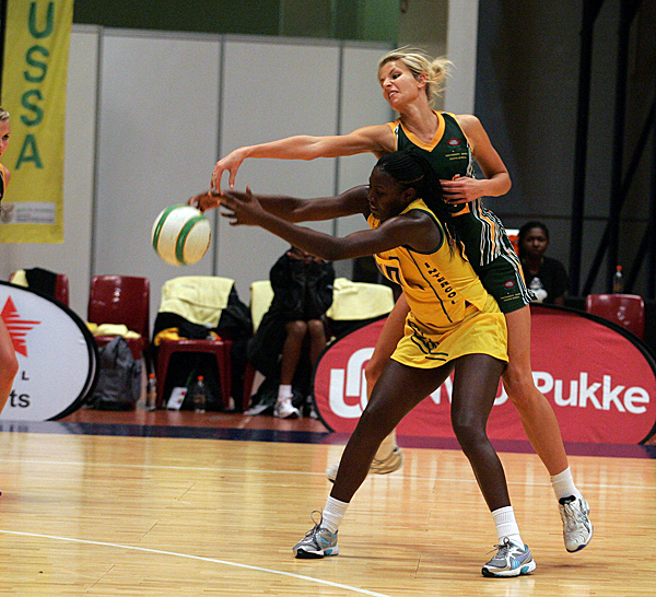 South Africa’s Goal Shooter Melissa Myburgh fights for the ball against Jamaican Goal Defence Malysha Kelly in their semi-final match of the WUNC on Friday 6 July 2012.