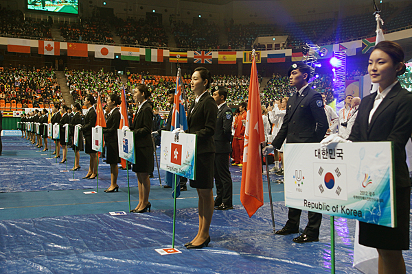 The ceremony started with the national anthem of Korea, and the flag of the host country was raised at the same time. Following the national anthem, the participating national teams marched into the stadium and received resounding applause from the spectators.