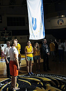 After his closing, the EUSA flag was lowered, with the Gaudeamus Igitur playing in the background. The flag was passed to Mr Dragan Marusic, Rector of the University of Primorska, as the next European Universities Basketball Championship will be organised in Koper, Slovenia in 2015.