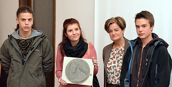 The students in charge of the design project presenting the medal for this 26th Winter Universiade