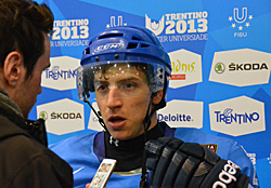 Simon Kostner (ITA) scores the first goal of the WU men’s tournament