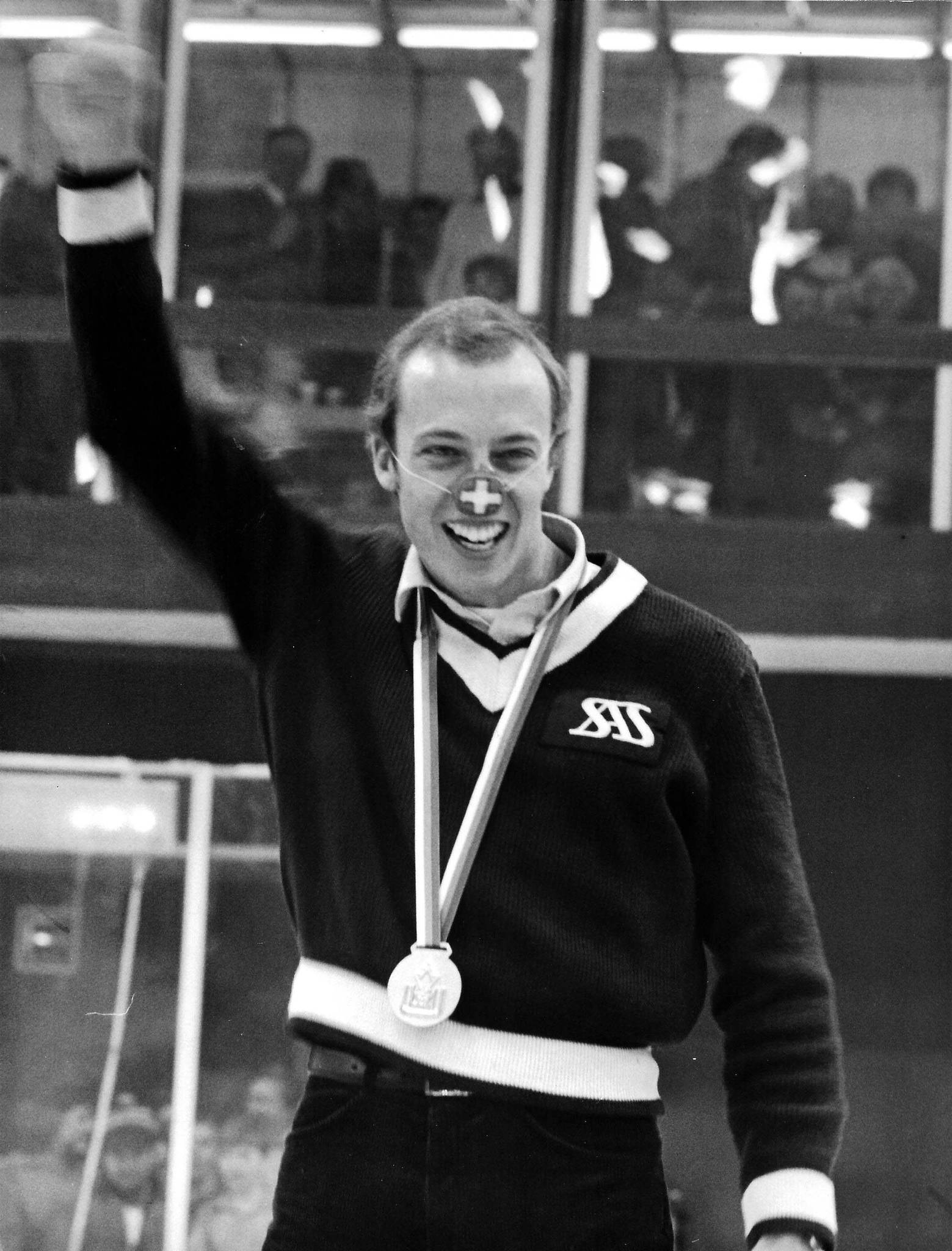 Denis Du Pasquier celebrates his gold medal in alpine skiing at the 1983 Winter Universiade by wearing a red nose with the Swiss flag taped on it