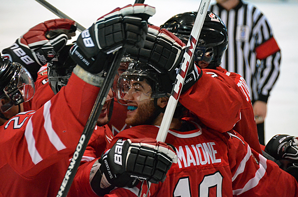 Canada celebrates after winning gold at the 2013 Winter Universiade in men’s hockey with a 6-2 win over Kazakhstan
