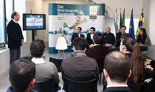 With only nine months to the opening ceremony of 2014 World University Handball Championship that will be held in the Portuguese city of Guimarães, from 3 to 10 August, and in the end of the inspection visit of the FISU Technical Delegate for Handball, Frantisek Taborsky and the FISU WUC Department Executive Assistant, Julien Buhajezuk, the local Organizing Committee prepared a session that was attended by the Vice-President of Guimarães City Hall, Amadeu Portilha, the Vice-President of the Handball Federation of Portugal, Augusto Silva, the Vice-President of the Portuguese University Sports Federation (FADU), the President of the OC and President of University of Minho Students Union, Carlos Videira and the Secretary-General of the OC and Director of the UMinho Sports Department, Fernando Parente, among others, to present this event.