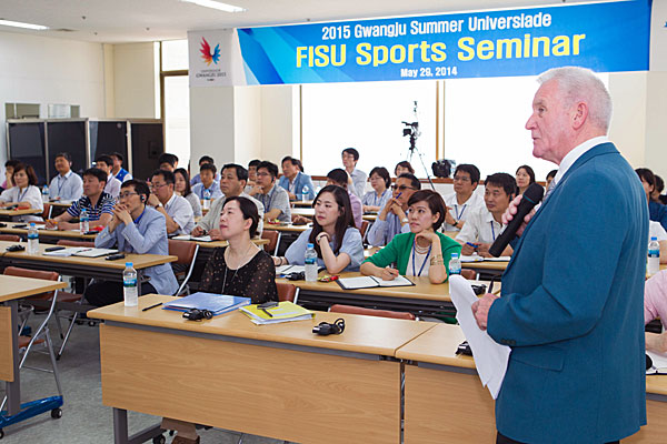 On May 29th, before the official inspection began, the members of the FISU Secretariat together with the Gwangju Universiade Organizing Committee (GUOC) held a general introductory meeting to discuss the preparation of the inspection visits to be held throughout the upcoming days. Afterwards, Mr. John Warnock, FISU CTI-UE Chair; Melanie Stallecker, FISU Sport Assistant; Mirjana Cvijanovic, FISU Technology Consultant and the invited speaker, Adam Sotiriadis, delivered a Sports Seminar.