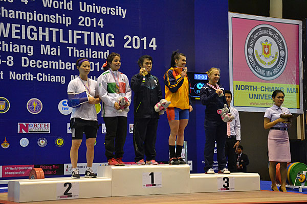CHIANG MAI – Days seem similar in Chiang Mai at the 4th WUC Weightlifting where the first gold medal was once again won by a local lifter. Indeed in the women’s 58kg snatch competition, Srisurat ensured Thailand of a new gold with a 95kg lift ahead of Park (KOR) 83kg and Heghis (ROU) 83kg. In the clean and jerk Srisurat took another gold with a 120kg barbell, 12kg over her closest opponent Candage (USA) 108kg, the bronze going to Lugo Robles (MEX) with 107kg. The total ranking offered a new gold to Srisurat (215) silver going to Lugo Robles (189kg) and bronze to Candage (188kg). 3rd at the recent IWF World Championship, IWF Junior World Champion in 2014, Srisurat added a prestigious line to her career records with this University Title.