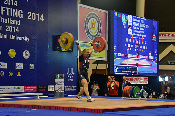 CHIANG MAI – Days seem similar in Chiang Mai at the 4th WUC Weightlifting where the first gold medal was once again won by a local lifter. Indeed in the women’s 58kg snatch competition, Srisurat ensured Thailand of a new gold with a 95kg lift ahead of Park (KOR) 83kg and Heghis (ROU) 83kg. In the clean and jerk Srisurat took another gold with a 120kg barbell, 12kg over her closest opponent Candage (USA) 108kg, the bronze going to Lugo Robles (MEX) with 107kg. The total ranking offered a new gold to Srisurat (215) silver going to Lugo Robles (189kg) and bronze to Candage (188kg). 3rd at the recent IWF World Championship, IWF Junior World Champion in 2014, Srisurat added a prestigious line to her career records with this University Title.